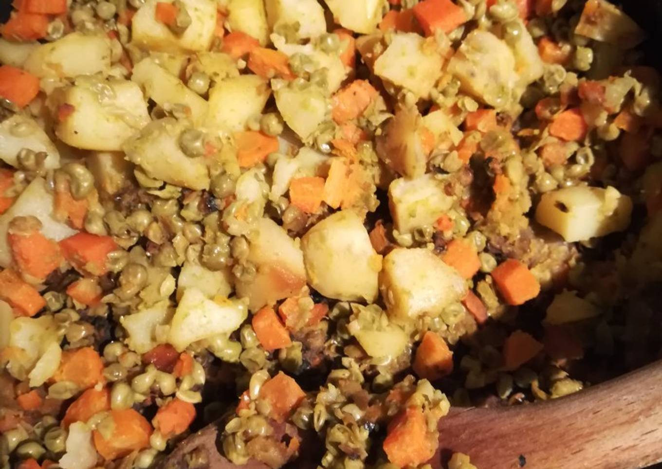 - Y mettre les carottes et pommes de terre épluchées et coupées en dés. Laisser cuire à feu doux en ajoutant de l'eau de temps en temps pour éviter que ça crame. Ajouter les petits pois en d'un de cuisson