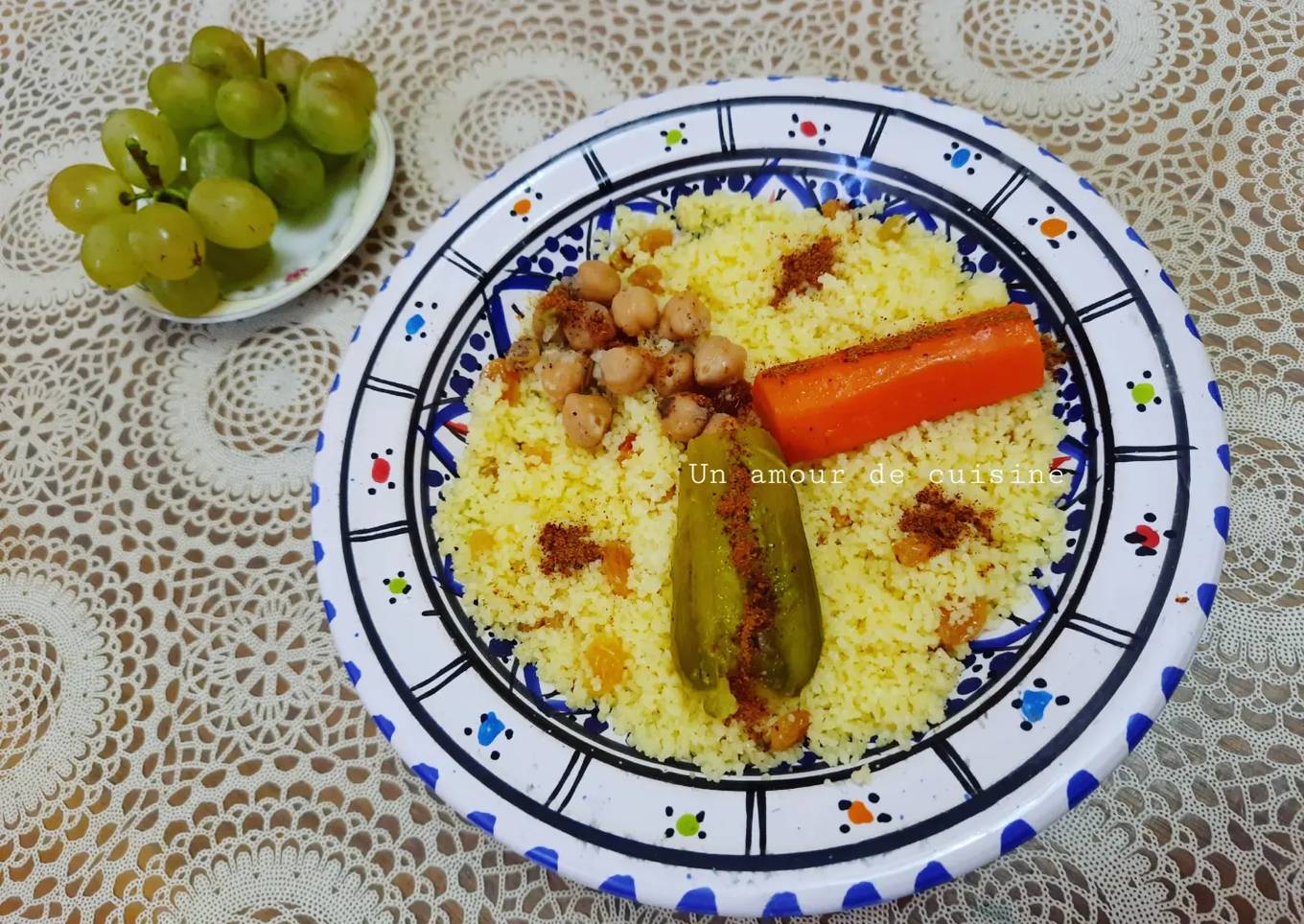 - Servez le couscous chaud agrémenté de légumes, pois chiches, cannelle en poudre et accompagné de raisins blancs et de la sauce.